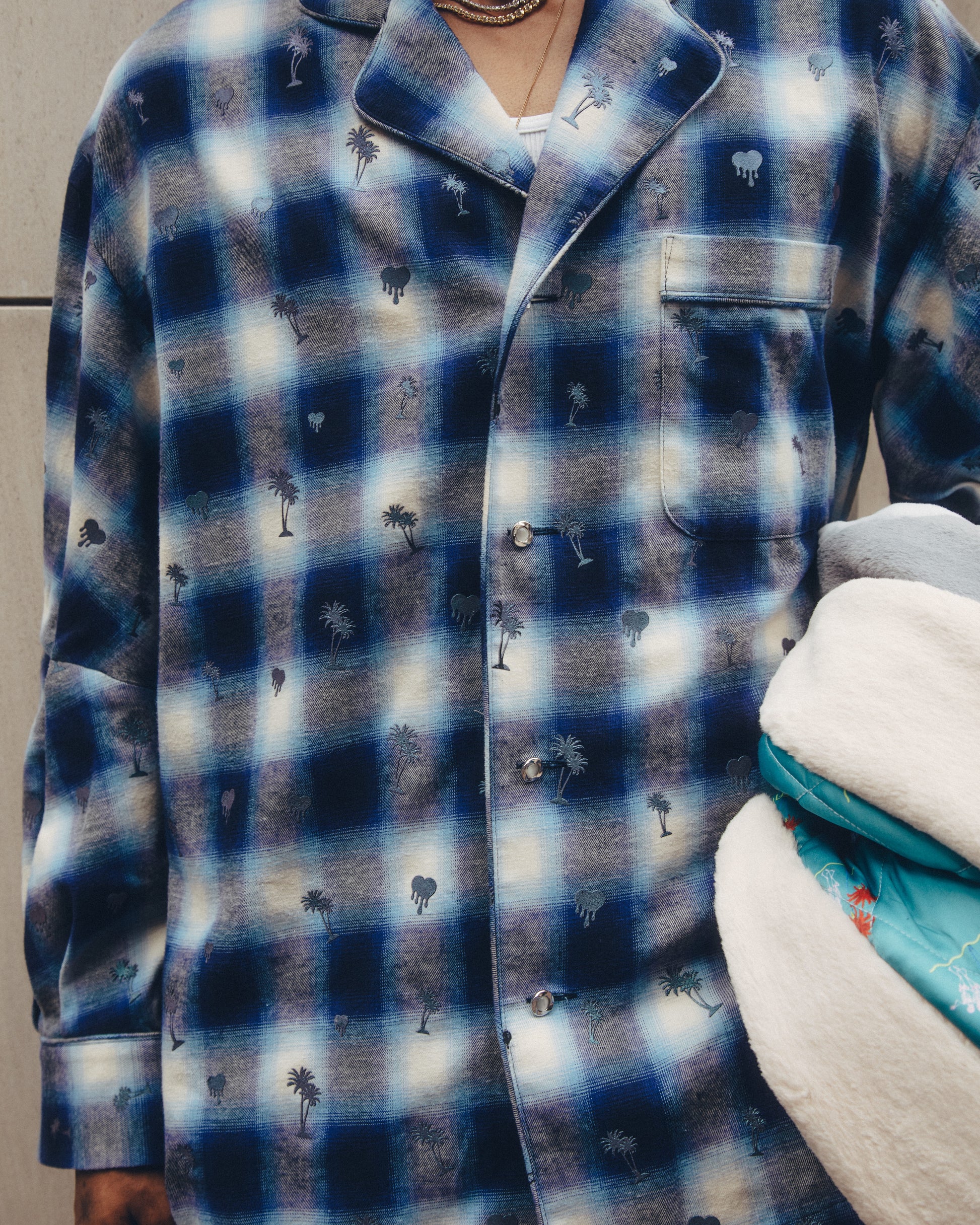 The graphic print incorporates a waterwheel motif with a taste of Tokyo's downtown area.