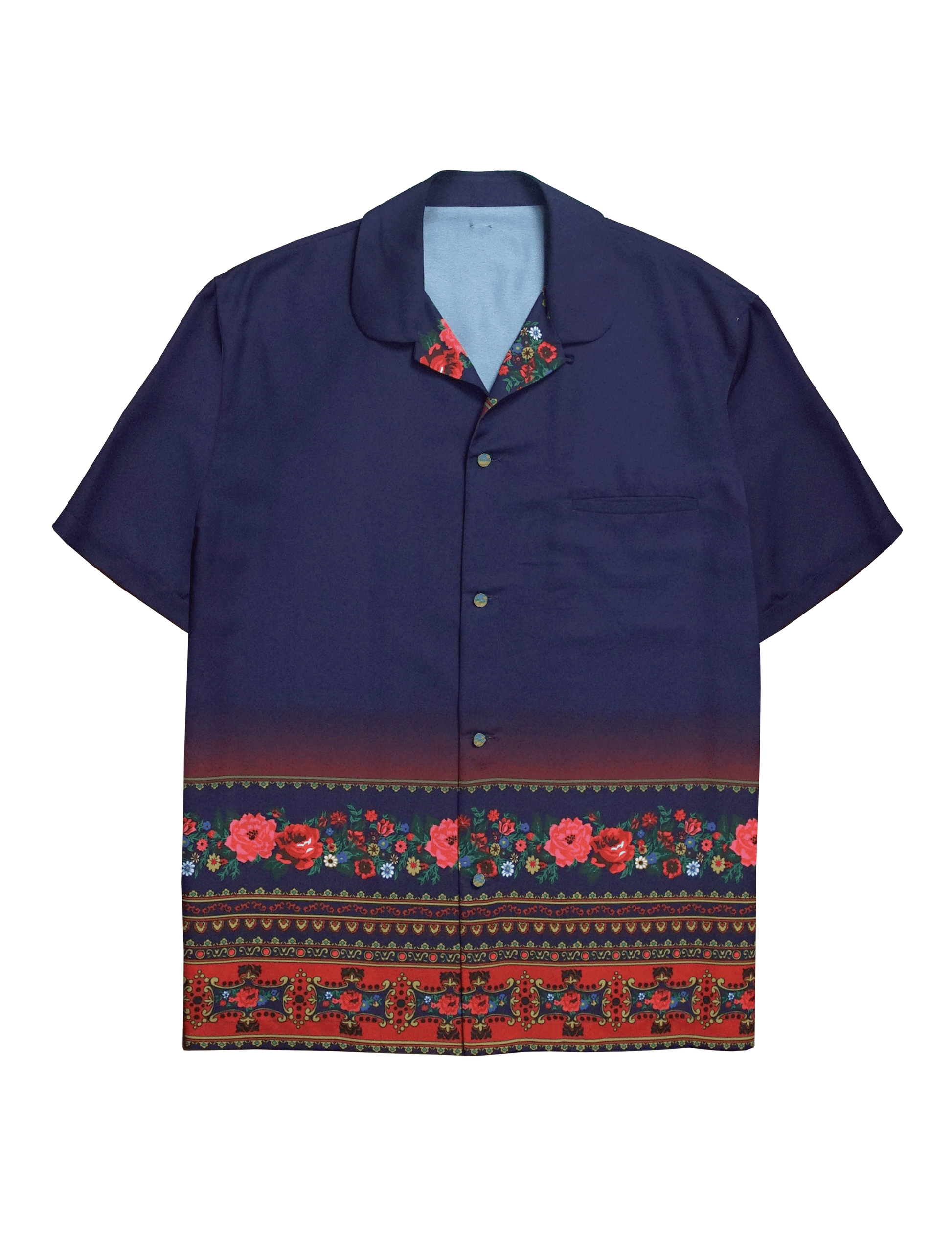 カラーグラデーションから花柄、そして襟裏にも密やかに仕込まれた装飾。落ち着いた光沢と軽さを両立した、バックサテンの素材使い。